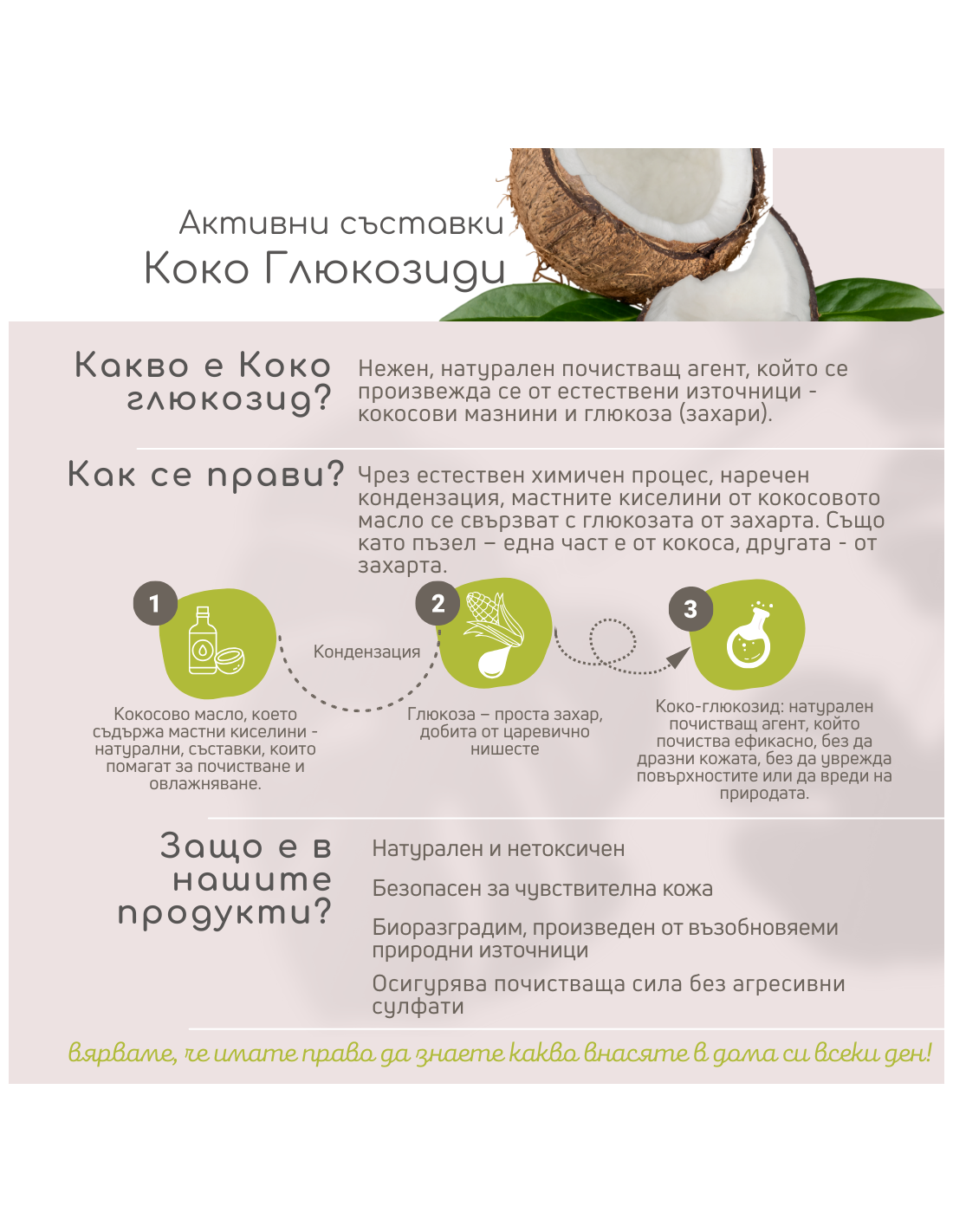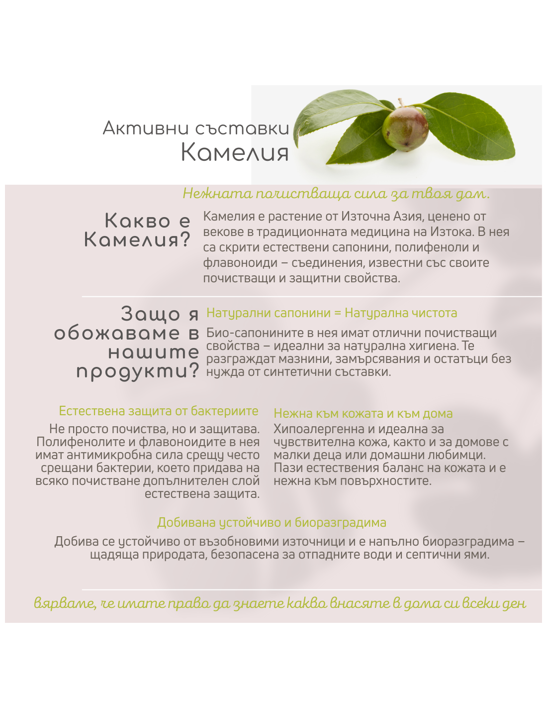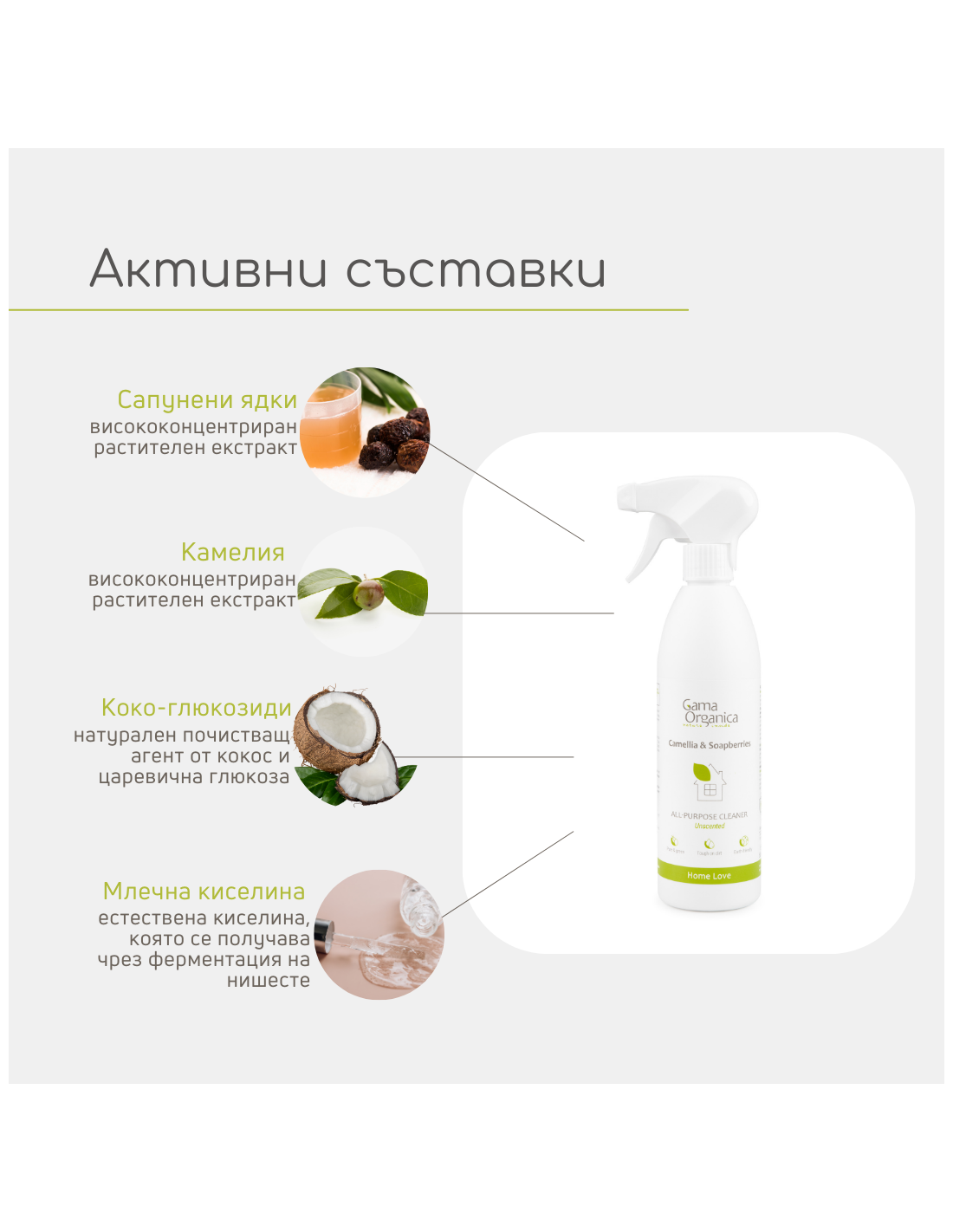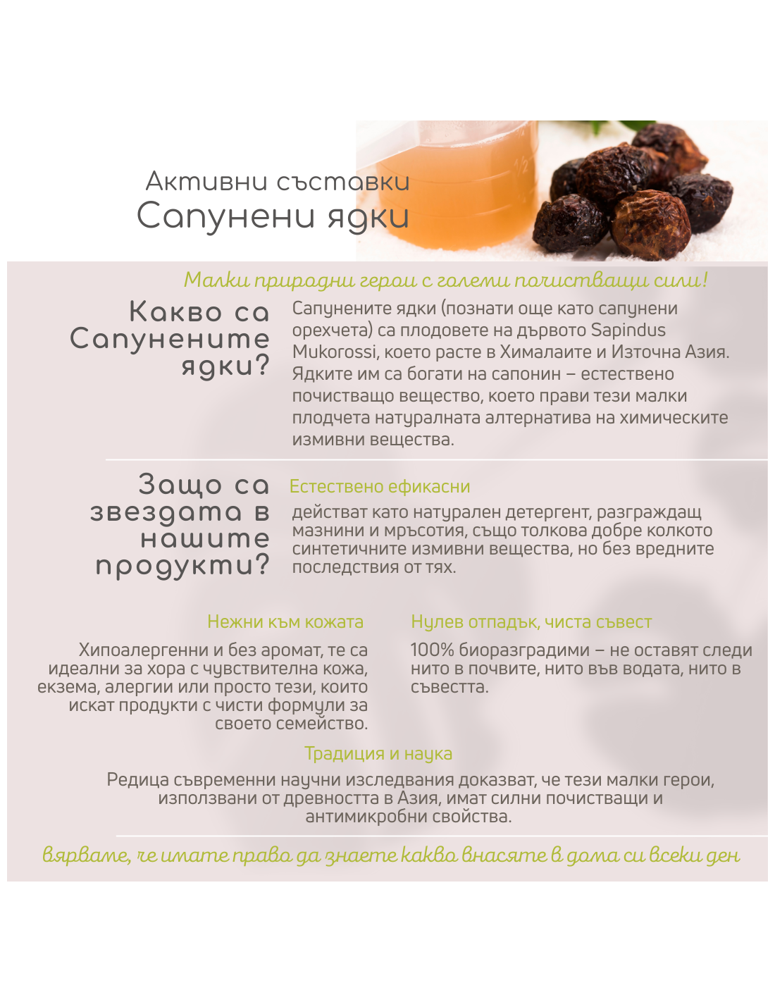 Този натурален Универсален почистващ препарат с растителни сапонини и 100% натурален аромат от чисти етерични масла почиства ефикасно всякакви повърхности у дома – от кухненския плот до банята. Направен с растителни екстракти, без опасни химикали, той пази здравето на семейството ви и природата.
